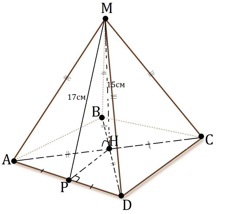 Знайдіть площу повної поверхні правильної чотирикутної піраміди , висота якої дорівнює 15см , а апофема - 17см .?