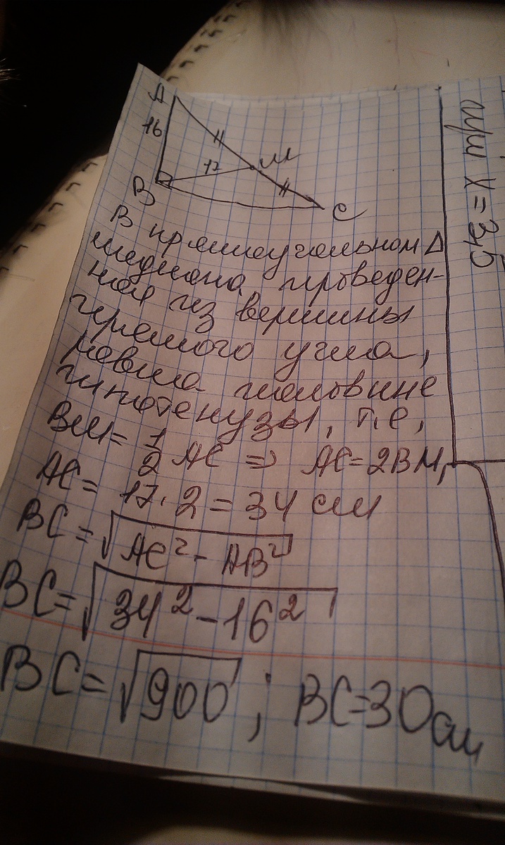 в прямоугольном треугольнике АВС с прямым углом В известны медиана ВМ=17 и катет ВА=16. найдите катет ВС этого треугольника
