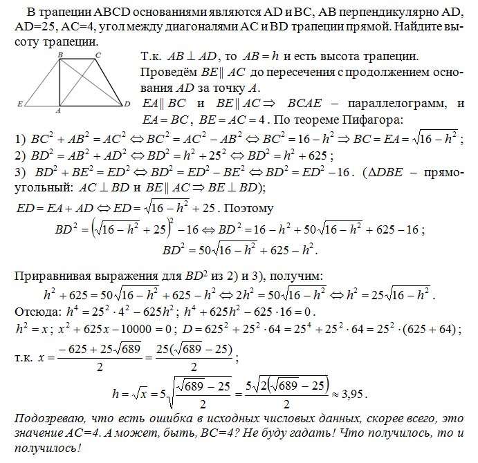 В трапеции ABCD основаниями являются AD и BC, AB перпендикулярно AD, AD=25,AC=4, угол между диагоналями AC и BD трапеции прямой. Найдите высоту трапеции.