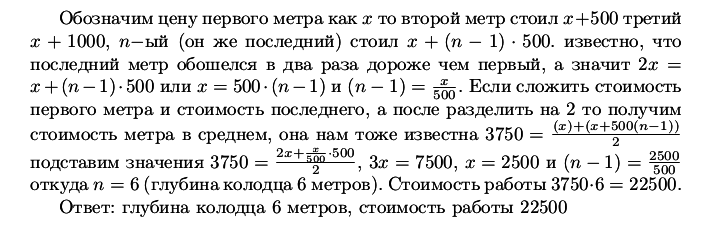 При рытье колодца договорились платить за каждый последующий метр глубины на 500р. больше,чем за предыдущий.Вследствие этого последний метр обошёлся в 2 раза дороже,чем первый.Средняя стоимость рытья одного метра составила 3750р.