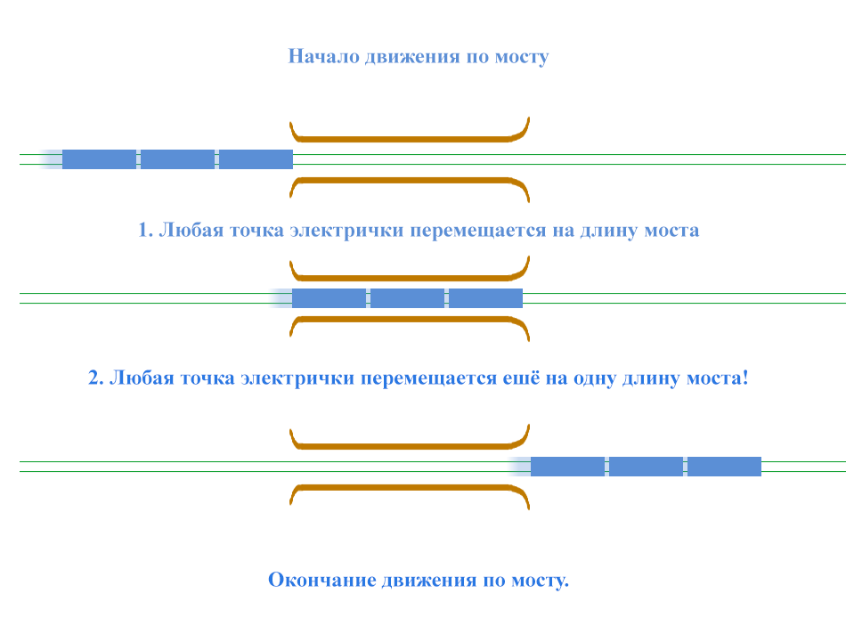 Для ответа на поставленный в задаче вопрос нужно понять, в чём заключается этот вопрос. Взглянем на чертёж, приложенный к задаче. Из него легко понять, что от того момента времени, когда первый (!) вагон электрички начал въезжать на мост до того момента, как последний (!) вагон выехал с моста – всё это время электричка находилась на мосту. А значит за время, пока электричка находилась на мосту, она проехала ДВОЙНУЮ длину моста