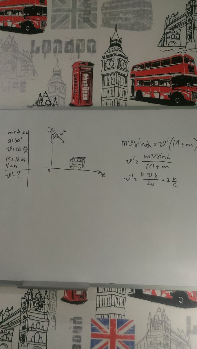 камень массой 4 кг падает под углом 30 градусов к вертикали со скоростью 10 м/с в тележку с песком общей массой М=16 кг, покоющуюся на горизонтальных рельсах. определите скорость тележки с камнем после падения в нее камня.