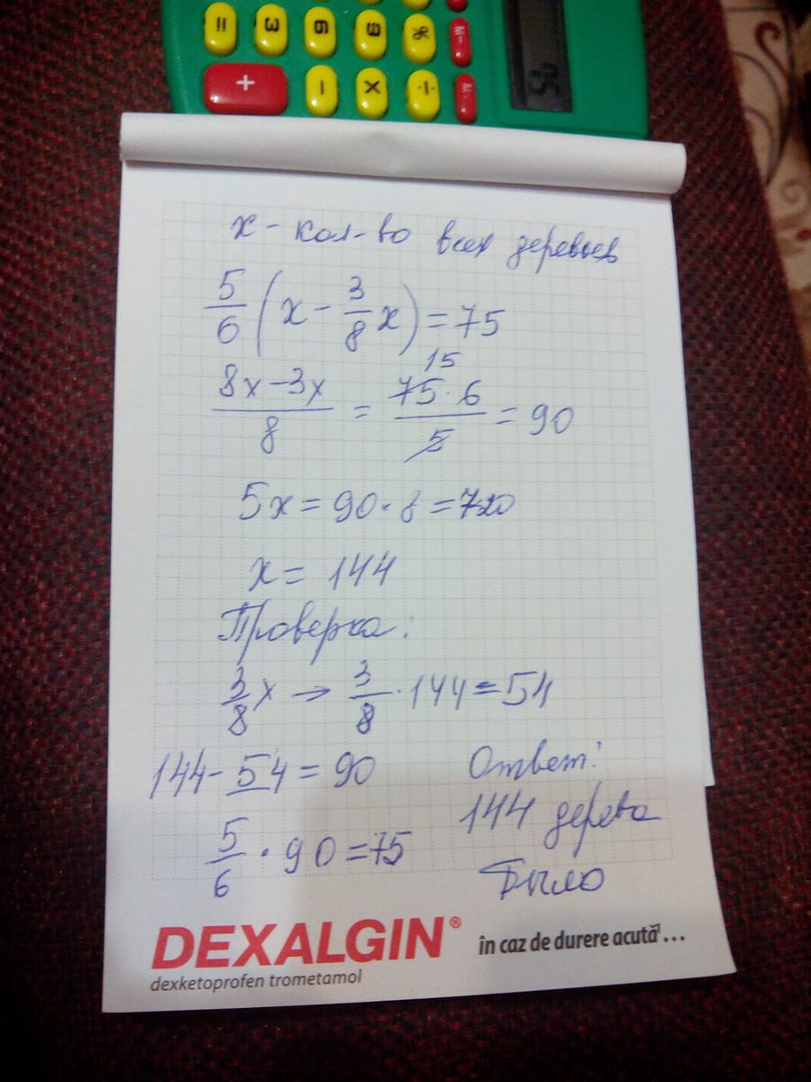 Первая группа посадила 38 части всех деревьев,а вторая группа 56 части оставшихся деревьев.Сколько деревьев должны были посадить две группы ,если вторая посадила 75 деревьев?