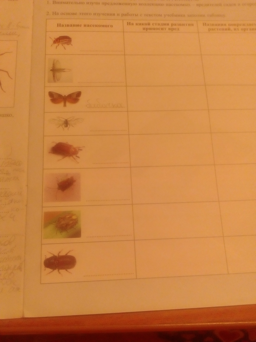 заполните первый столбик , там где надо написать по рисунку насекомых , прошу помогите пожалуй ста