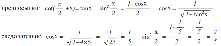 помогите ооооочень важно срочно решить !!!!!!!!!!!!!!!!!!!!!!!!!!найдите синус^2(x/2) если котангенс(пи/2 +х)=2корень из 6, х принадлежит (пи/6; пи/2)