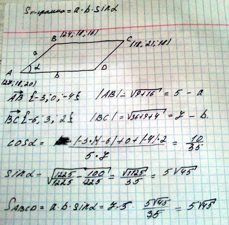 Вычислите площадь параллелограмма АВСD , если задано координаты трёх его вершин : А(27;18;20) , В(24;18;16) и С(18;21;18).