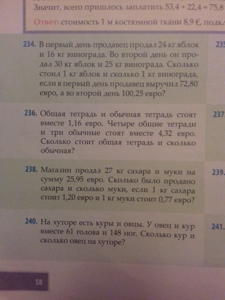 Ответ: 48 кур, 13 овец<<<<<<<>>>>>>> ############ 238 ############ система: 1,20х+0,77у=25,95, х+у=27; ############ 236 ############ система: х+у=1,16; 4х+3у=4,32 ############ 234 ############ 24х+16у=72,80; 30х+25у=100,25 >>>>>>>>Главное выразить одно через другое<<<<<<<<