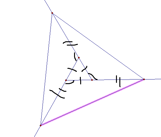 Три треугольника равны по углу(внешние к равностороннему) и двум сторонам (из пропорции). Значит стороны равны