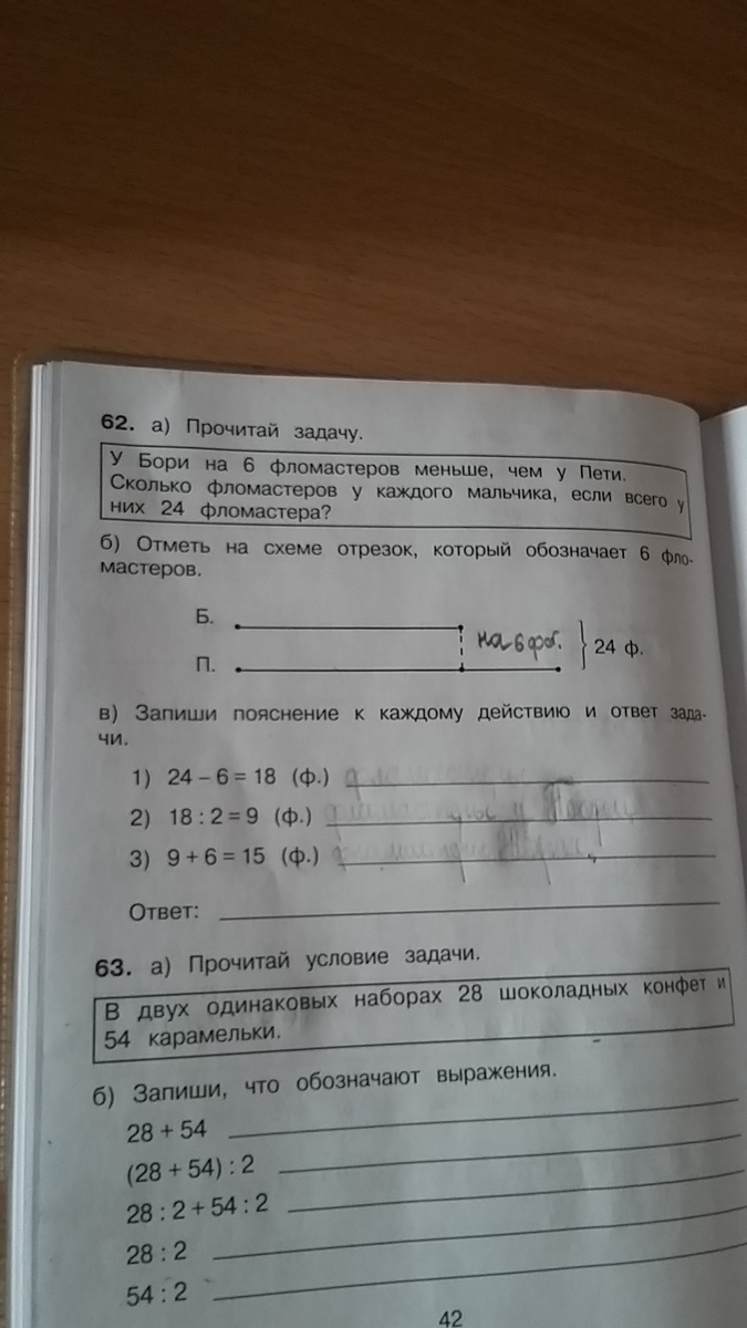 Помагите пожалуйста!У Бори на 6 фламастеров меньше чем у Пети.Сколько фламастеров у каждова мальчика если всего у них 28 фламастеров?