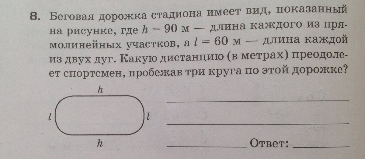 Беговая дорожка имеет вид (смотреть вложение), где h=90 м- длина каждого для прямолинейных участков, а l=60 м- длина каждой из двух дуг. Какую дистанцию (в метрах) преодолеет спортсмен, пробежав три круга по этой дорожке?