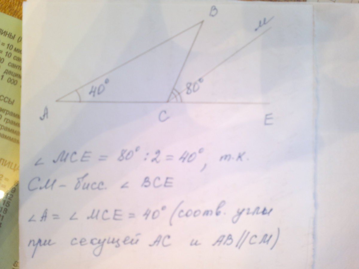 В треугрльнике ABC угол А равен 40 градусам а угол BCE , смежный с углом ACB равен 80 градусам.Доказать что биссектриса угла BCE параллельна прямой AB