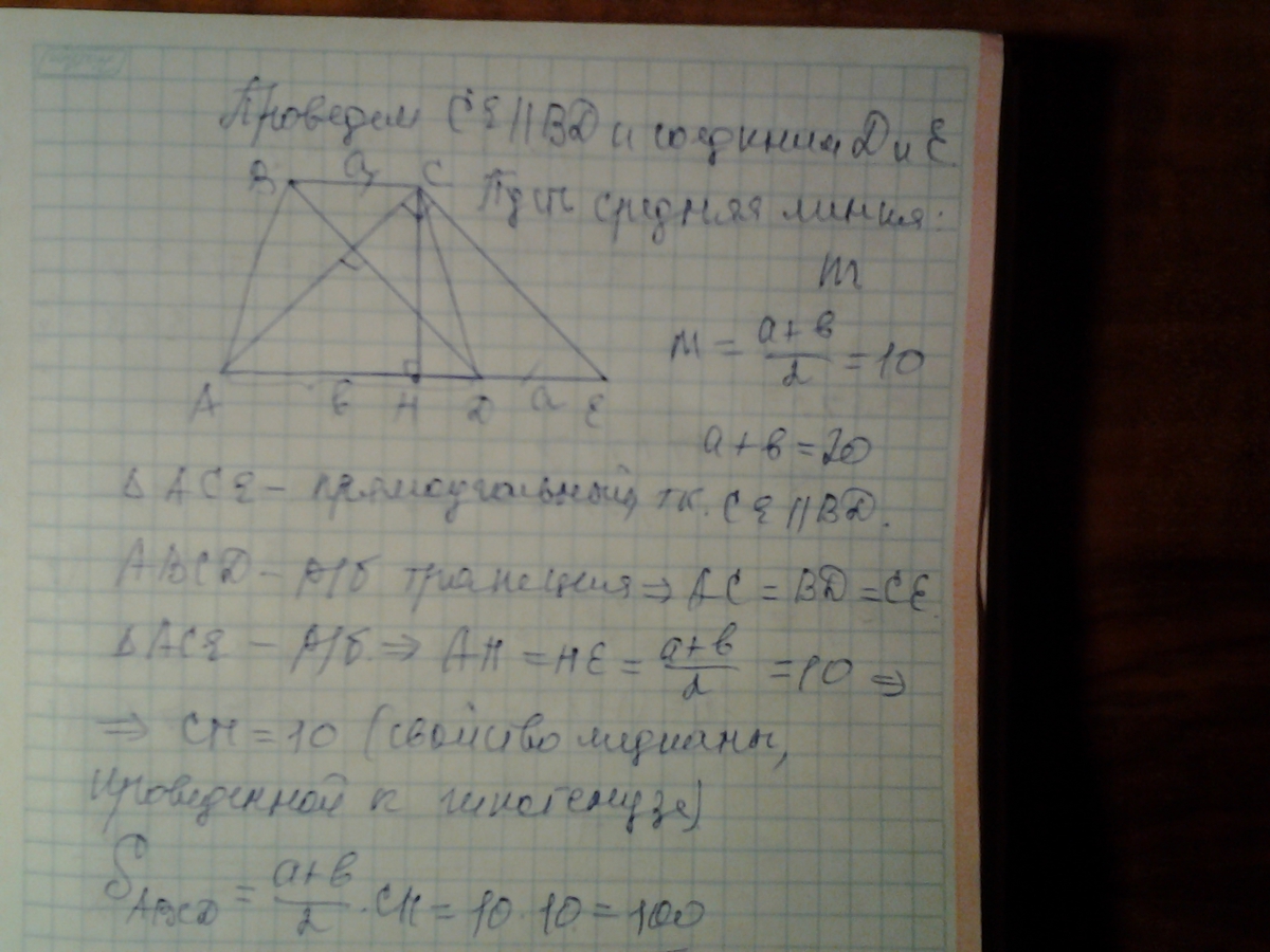 Если в равнобедренной трапеции диагонали взаимно перпендикулярны, а длина средней линии равна 10, то площадь этой трапеции