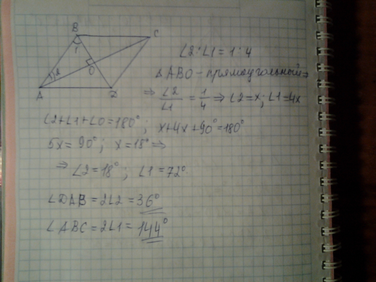 Кути, утворені діагоналями ромба з однією з його сторін, відносяться як 1 : 4. Визначте кути ромба.