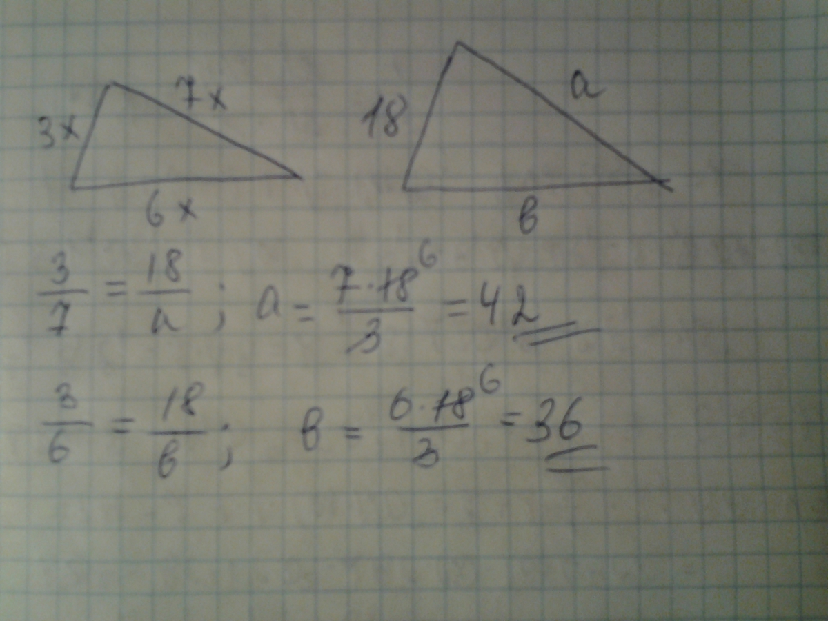 Сторони трикутника відносяться як 3 : 7 : 6. Менша сторона подібного йому трикутника дорівнює 18 см. Знайдіть сторони другого трикутника.