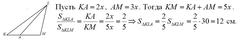 На стороне КМ треугольника KLM, площадь которого равна 30 см (кв), отмечена точка А так, что КА:АМ = 2:3. Найдите площадь треугольника KLA.