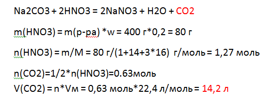 Какой объем газа выделится, если к раствору натрий карбоната пролить раствор азотной кислоты массой 400 г с массовой долей кислоты 20%?