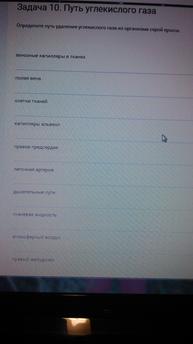 Клетка — тканевая жидкость — венозные капилляры — полая вена — правое предсердие — правый желудочек — легочная артерия — капилляры альвеол - атмосферный воздух.
