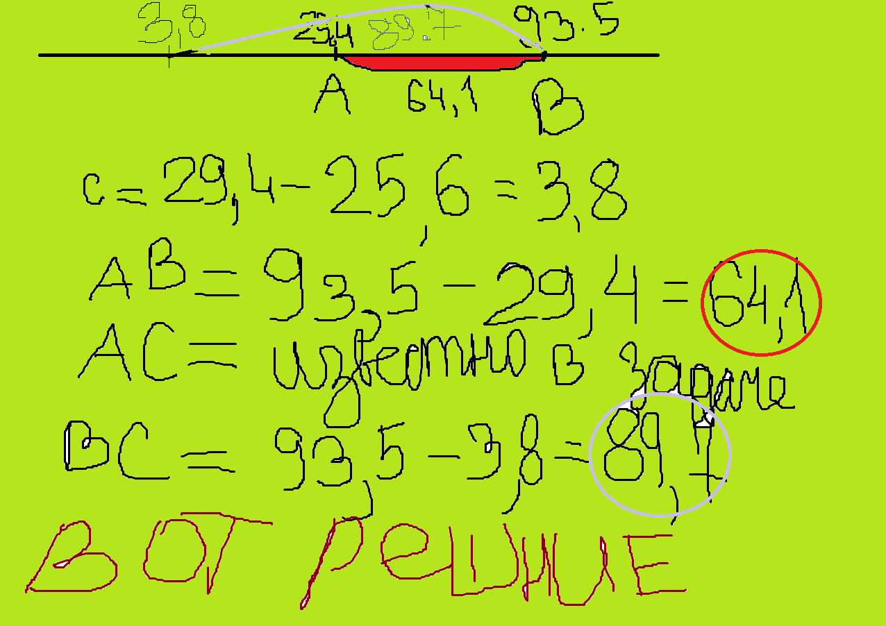 на координатном луче отмечены точки A(29,4),B(93,5)и C расстояниеот точки C до точки A равно 25,6 единичного отрезка найдите AB, AC и BC