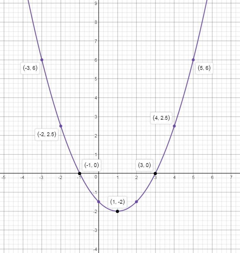 Постройте график функции y=0,5x2(кв.)-x-1,5.С помощью графика найдите:а)промежутки возрастания и убывания функции.б)наименьшее значение функции.в)при какиз значениях x y больше 0.(С рисунком, если можно)Заранее спасибо.