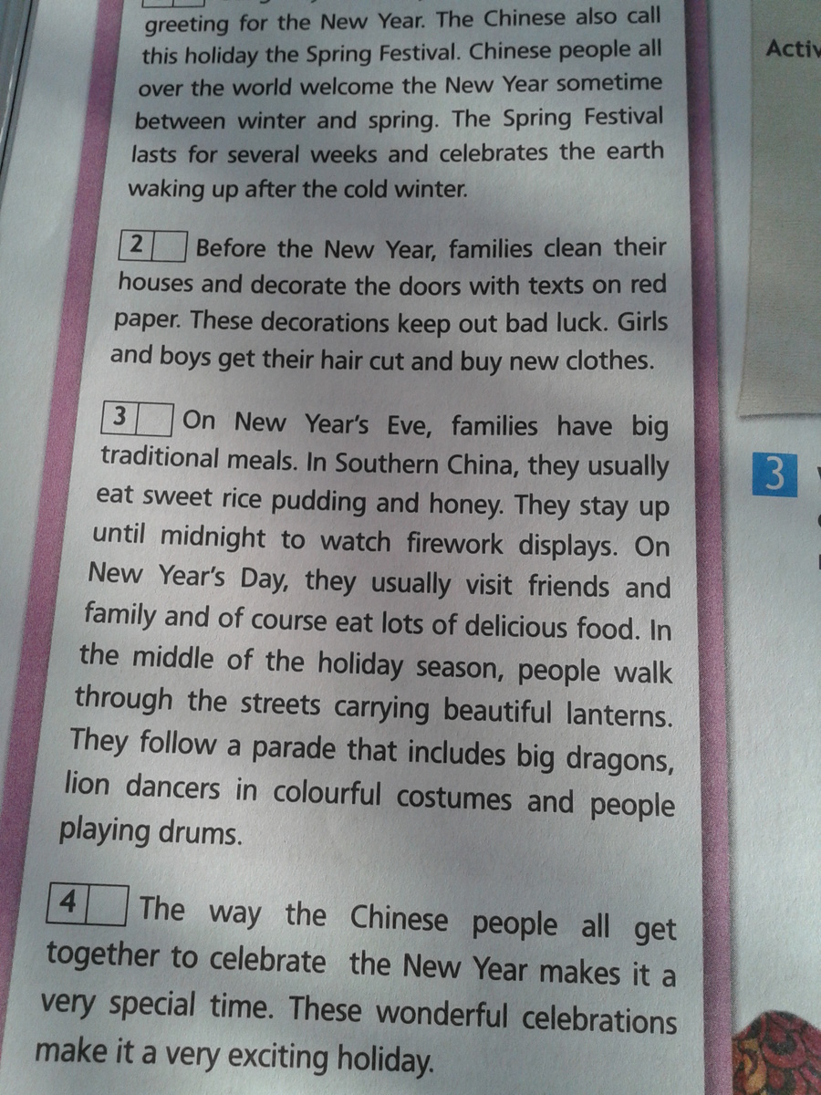 3. На предновогодний вечер семьи имеют традиционные блюда. В Южном Китае они обычно едят сладкий рисовый пудинг и мед. Они не ложатся спать до полуночи чтобы посмотреть фейерверк. На новый год они обычно ходят в гости к друзьям и семье и конечно едят много вкусной еды. В середине новогодних каникул люди гуляют по улицам c красивыми фонарями. Они следую параду в котором есть большие драконы, танцоры в разноцветных костюмах и люди играющие на барабанах.
