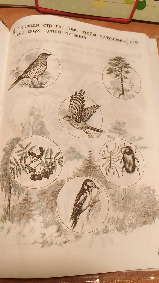 Сокол ест птицу которая ест ягоды. дятел ест жука который ест кору дерева . Тут 2 цепочки.