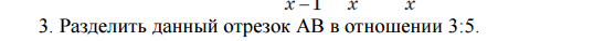 Чтобы разделить отрезок в отношении 3:5, надо этот отрезок разделить на 8 равных частей, отсчитать от вершины А 3 части и постаить точку. Эта точка и разделит данный отрезок в данном отношении.