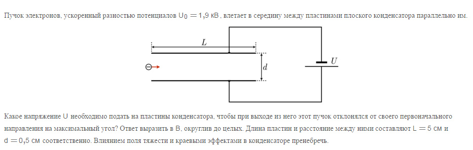 По вертикальной оси на электрон действует электрическое поле F=qE, где Е=U/d- напряженность поля, F=qU/d. Под действием этой силы у электрона имеется ускорение a=F/m=qU/(dm). Угол отклонения будет максимальный, если электрон по вертикали отклонится на высоту d/2,