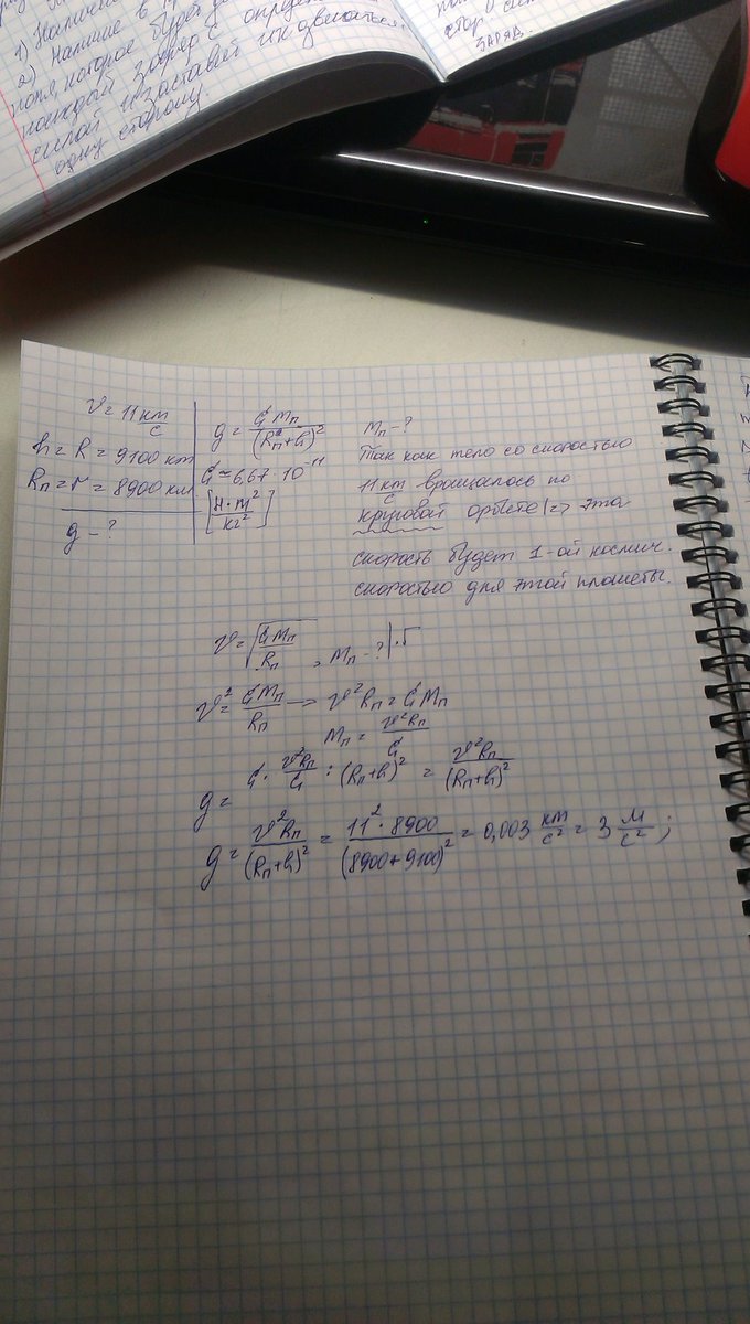 Подлетев к неизвестной планете, космонавты придали своему кораблю горизонтальную скорость 11 км/с. Эта скорость обеспечила полёт корабля по круговой орбите радиусом 9100 км. Каков ускорение свободного падения у поверхности планеты, если её радиус 8900 км?