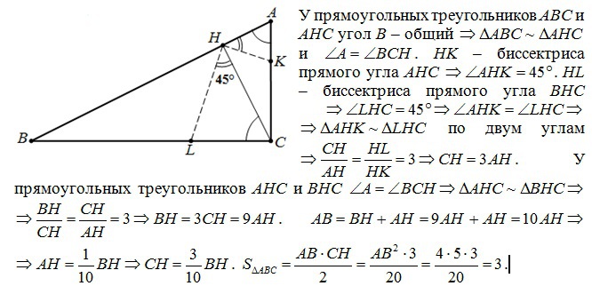 Отрезок CH- высота прямоугльного треугольника ABC ( C=90 градусов ) . HL=3HK, где HL и HK - биссектрисы треугольников BCH и АСН соответственно, АВ=2*√5. Найти площадь ABC