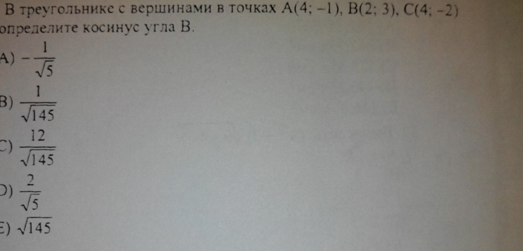 В треугольнике с вершинами А(4;-1), B(2;3), C(4;-2) определить косинус угла В.