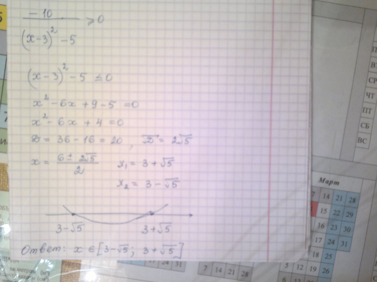 Там -5 под дробью стоит тоесть вот так:((x-3)^2-5)>или равен 0