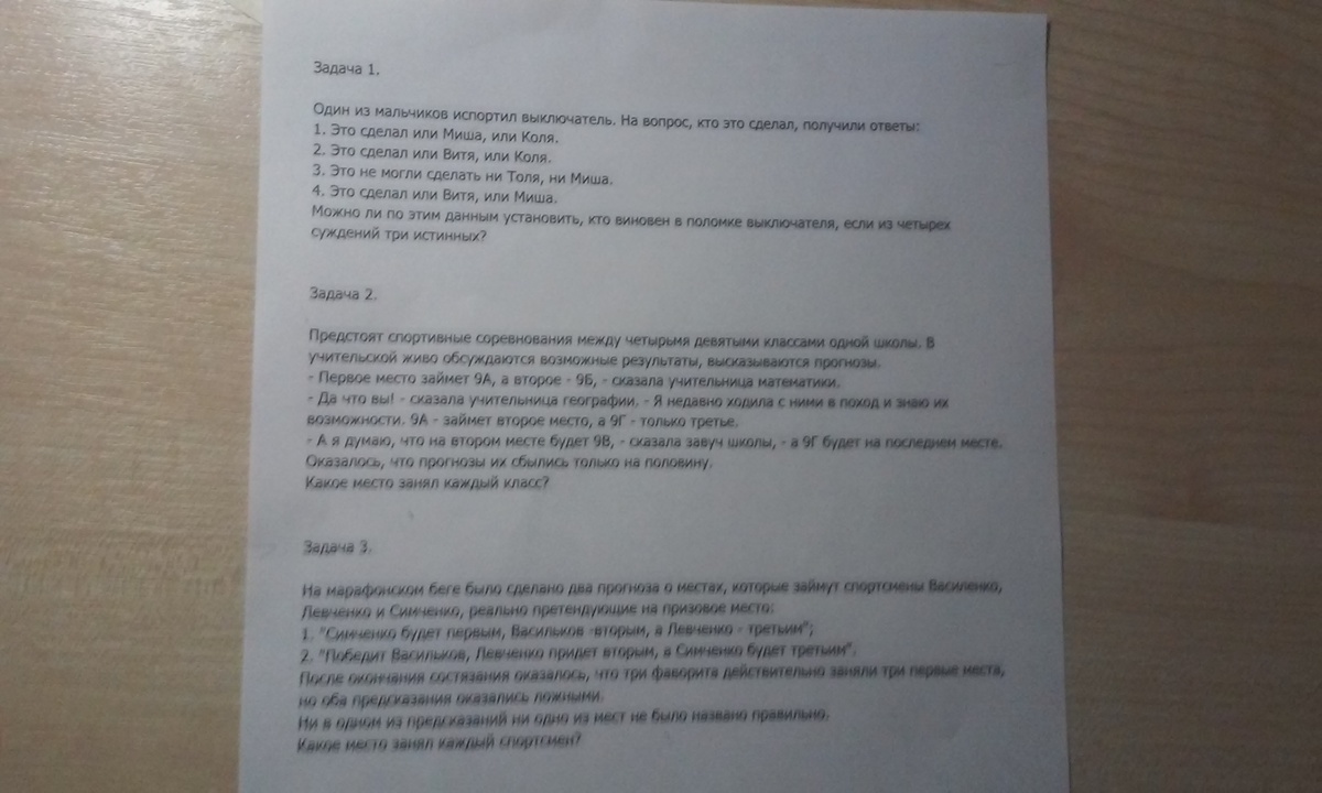3) фамилии обозначаю по первым буквам. Вариант 1) С-1,В-2,Л-3, вариант 2) С-3,В-1,Л-2. Так как предположения оказались неверными, выбираем те места, которые не предполагались. Значит у Л-1 место у С-2, а у В-3