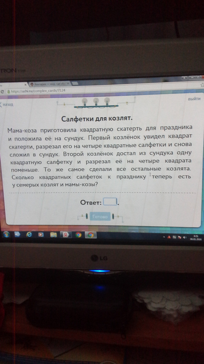 каждый козленок увеличивал число салфеток на 3; одну брал, а возвращал 4; значит салфеток стало 1+3*7=22))))