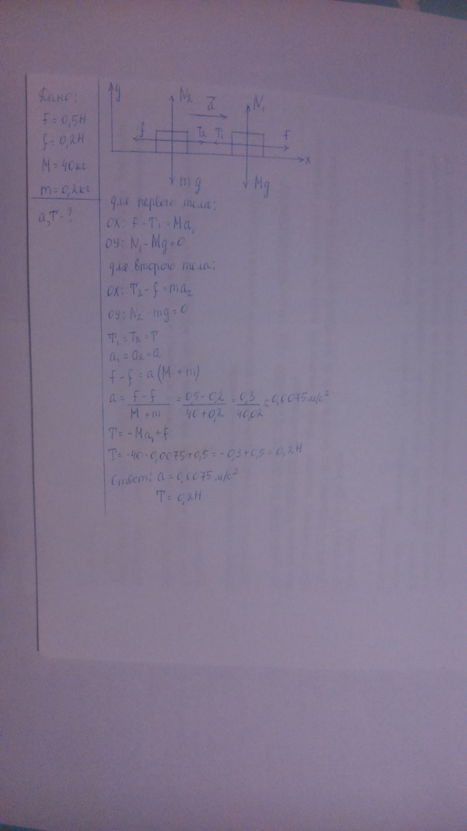 Определить ускорение и силу натяжения нити, если F=0.5H, f=0.2H масса тел M=40кг, m=0.2кг. Трением пренебречь. Тела тянут в разные стороны в горизонтальном направлении.