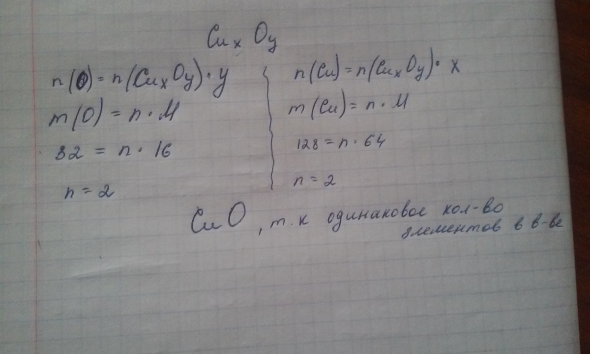 Химический анализ показал, что в 160 г образца некоторого соединения содержится 128 г меди и 32 г кислорода. Какова формула этого соединения?