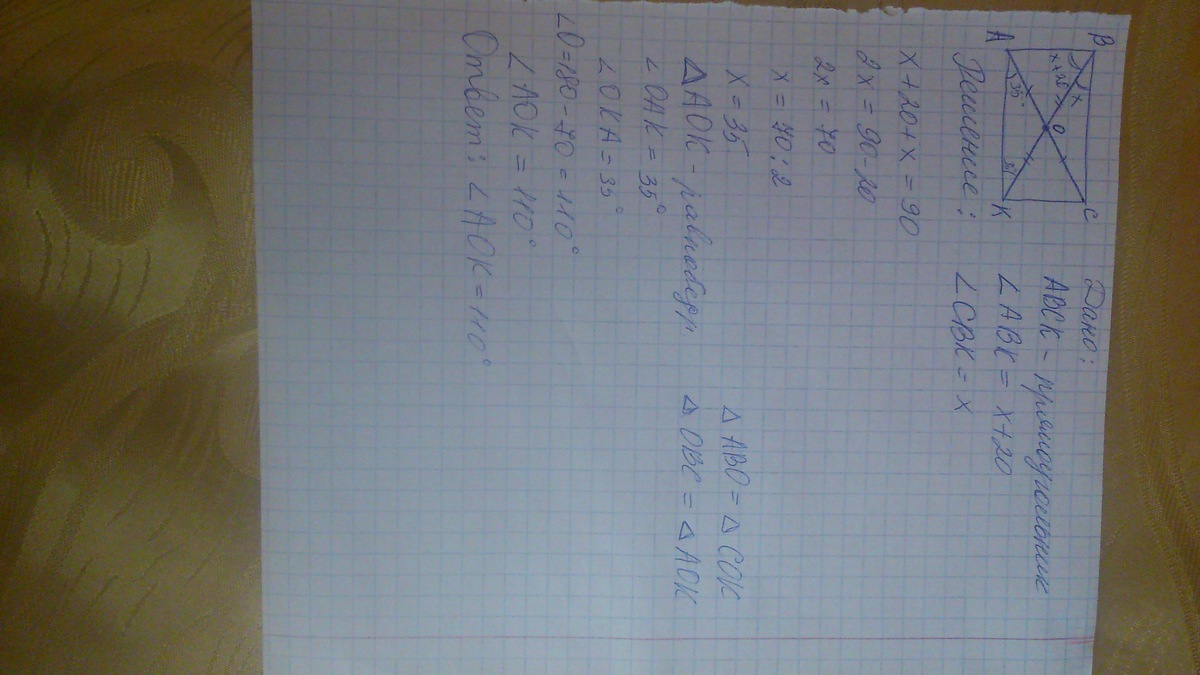 в прямоугольнике АВСК диагонали пересекаются в точке О.угол АВК больше угла СВК на 20 градусов.найдите углы треугольника АОК