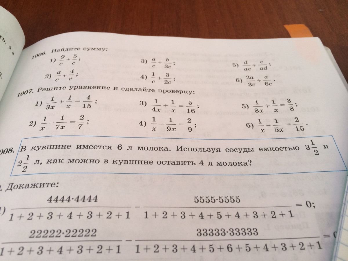 в каждый кувшин налить 1л молока что-бы в основном осталось 4л