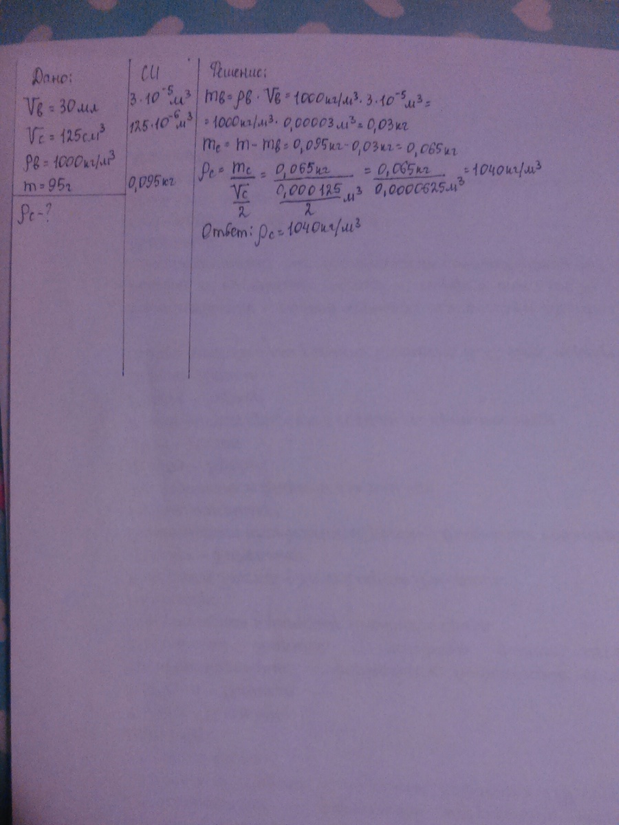 На завтрак кот съедает половину сардельки и выпивает 30 мл30 мл воды. Какова плотность сардельки, если после трапезы кот «потолстел» на 95 г95 г, а объём сардельки составляет 125 см3125 см3? Ответ выразите в кг/м3кг/м3, округлив до целых. Плотность воды составляет 1000 кг/м31000 кг/м3.
