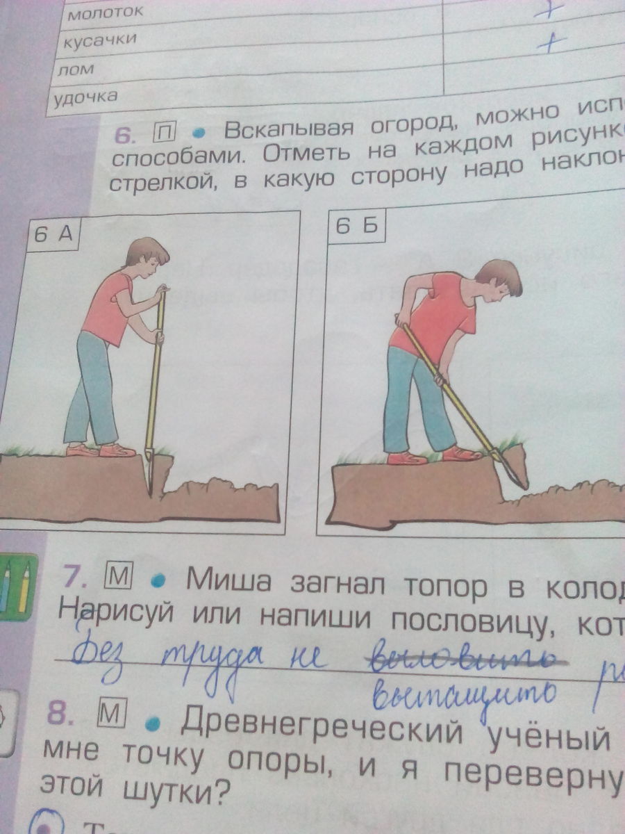 д0вумя способами .Отметь на каждом рисунке точку опоры.Покажи стрелкой , в какую сторону надо наклонить ручку лопаты.