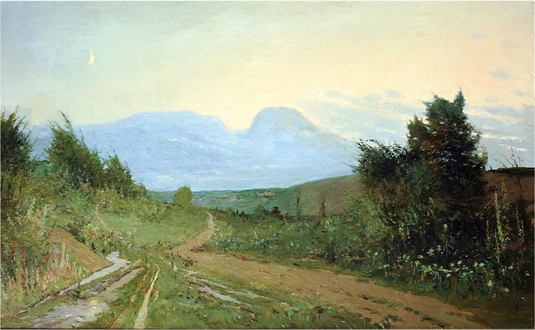 они из интернета взяли : На первый взгляд погода пасмурная,ветреная,по небу плывут облака,деревья качаются. По обе стороны от дороги растут кустарники и деревья. Дорога размытая. Дорога уходит куда-то вдаль. По краям дороги растут невысокие растения сочно-розового цвета. Деревья и растения растут на возвышенности. Картина написана в тёплых тонах. Впереди видны горы и дорога ведущая куда-то вдаль.
