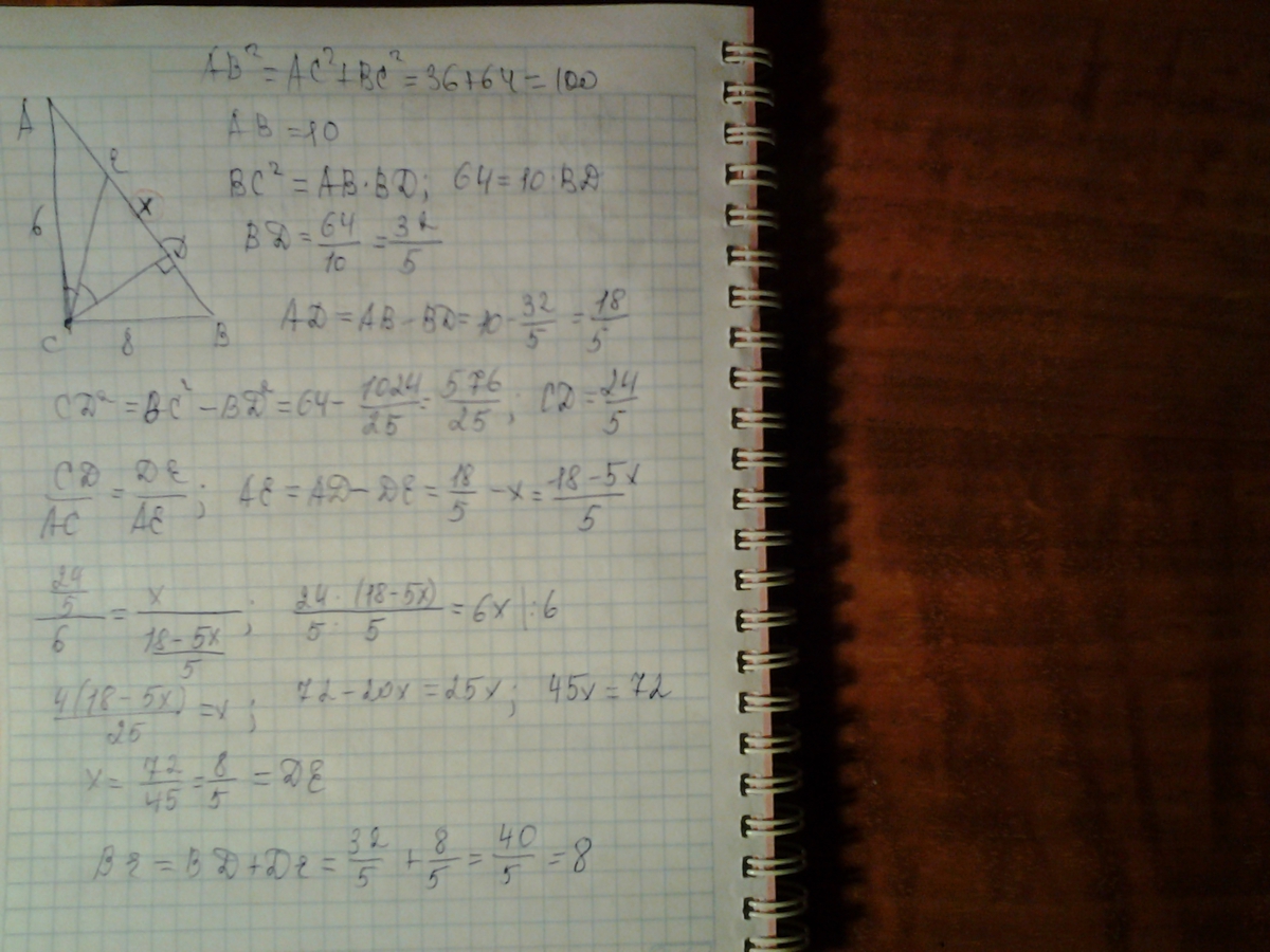В прямоугольном треугольнике ABC из вершины C прямого угла проведена высота CD,_а в треугольнике ADC проведена его биссектриса CE.Найдите длину отрезка BE,если известно,что AC=6,BC=8.