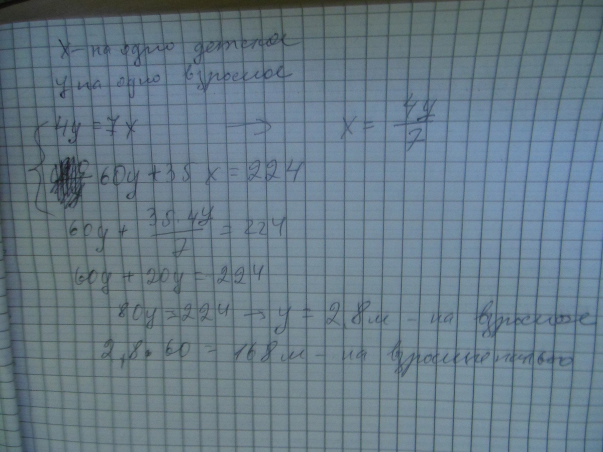 На 4 пальто для взрослых шло столько материи, сколько на 7 детских пальто.Сшито 60 пальто для взрослых и 35 детских пальто, на что израсходовано 224 м материи.Сколько материи пошло на все пальто для взрослых ?