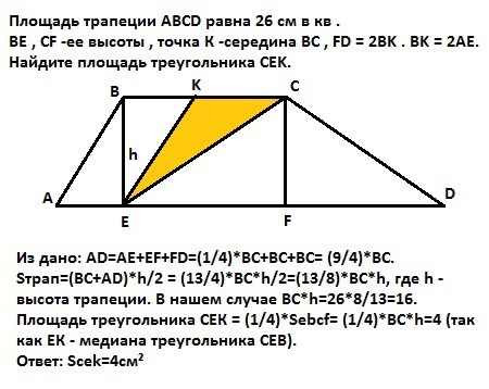 Sтрап=26см²=(ВC+AD)*h/2 = (13/4)*ВС*h/2=(13/8)*BC*h, где h - высота трапеции.