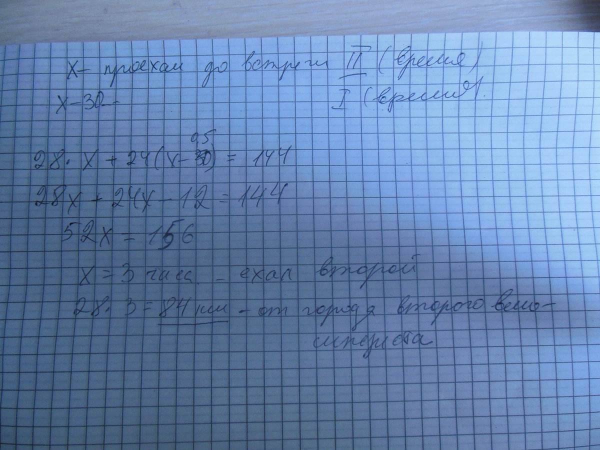Из двух городов одновременно навстречу друг другу отправились два велосипедиста. Проехав некоторую часть пути, первый велосипедист сделал остановку на 30 минут, а затем продолжил движение до встречи со вторым велосипедистом. Расстояние между городами составляет 144 км, скорость первого велосипедиста равна 24 км/ч, скорость второго — 28 км/ч. Определите расстояние от города, из которого выехал второй велосипедист, до места встречи.