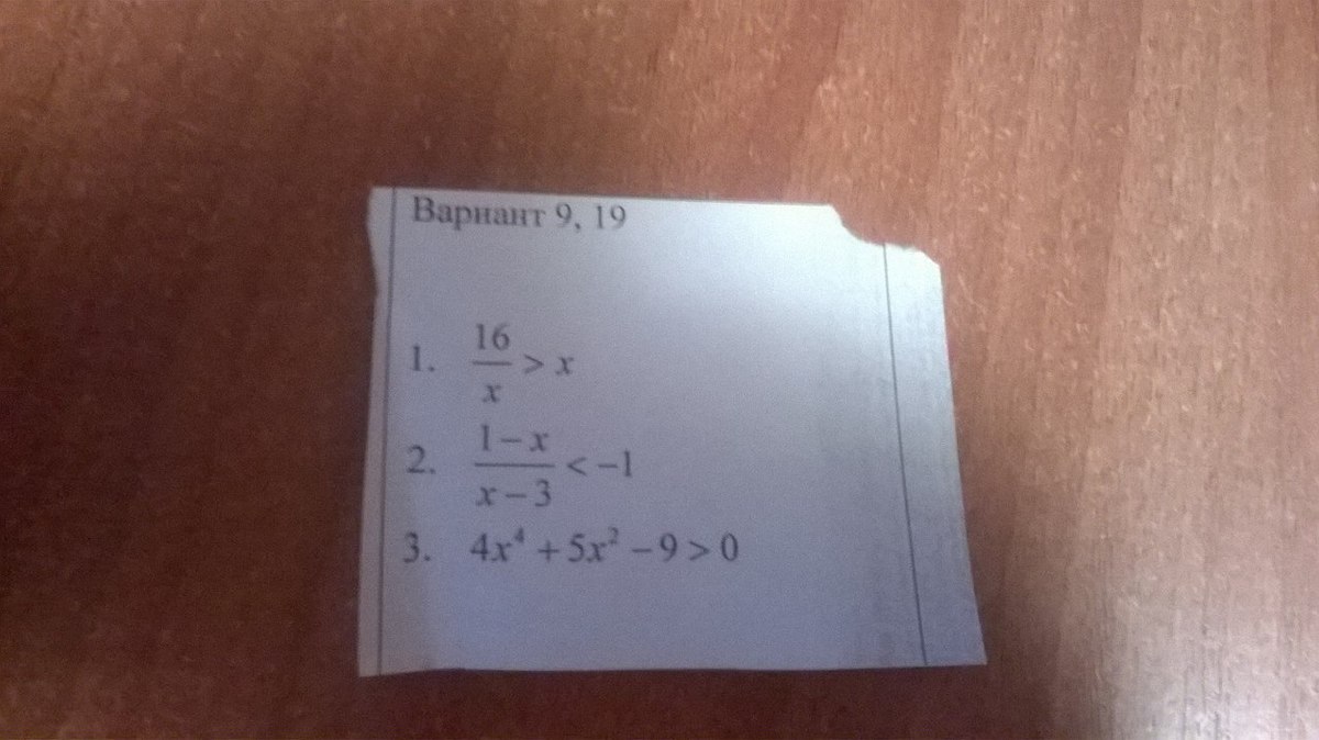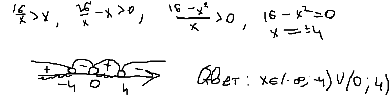 первое: скобки круглые, т.к. знак неравенства строгий, отмечаем 0 круглым значком, т.к. x не равен 0 (стоит в знаменателе), потом находим корни числителя и наносим их на координатную прямую. подставля числа из интервалов, находим знаки. ответом являются те интервалы, на которых знак тот, который в условии