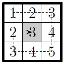 Петя заполняет квадратную таблицу со стороной 11 числами по спирали по часовой стрелке по следующему правилу: в левом верхнем углу пишет 1, затем двигается по спирали, если сдвигается вправо или вниз, то к числу прибавляет 1, если влево или вверх, то вычитает 1. Какое число будет записано последним? Например, если сторона равна 3, то таблица будет выглядеть так, как на рисунке. Последним записано число 3.