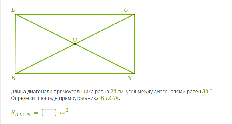 Найдём угол KCN: KCN=(180-30)/2=75. Можно выразить сторону KN через синус угла KCN: KN=KC*sinKCN=26*sin75, что примерно равно 25. Выразим сторону CN через косинус угла KCN: CN=KC*cosKCN=26*cos75, это примерно равно 7. Итак, стороны прямоугольника равны 25 см и 7 см. Перемножим эти значения и получим S=25*7=175 см2.