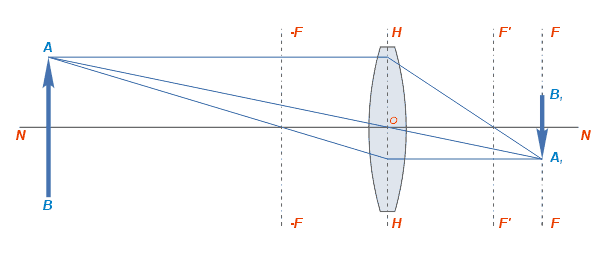 Нарисуй собирающую линзу (вид с боку). На нее падают лучи, преломляются (луч по центру линзы не преломляется), все лучи собираются в одну точку (фокус), и расходятся за фокусом дальше. За фокусом изображение уже будет перевернутое.