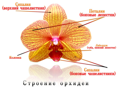 Величина цветков варьируется от нескольких миллиметров до 20-25 см. Чаще всего они собраны в соцветия, но иногда бывают и одиночными. Строение цветка характеризуется наличием центральной симметрии, благодаря которой они легко узнаваемы. Орхидеи имеют три сепалии (окрашенные чашелистники), которые чередуются с тремя петалиями (лепестками), подобно своим родственницам лилиям. Однако центральная петалия орхидеи трансформировалась в уникальную структуру, названную лабеллум, или губа. Форма и окраска губы у разных видов очень разнообразна, но назначение у неё одно - она служит "посадочной площадкой" для насекомых опылителей.