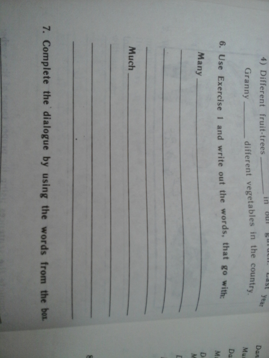 6. Используя первое упражнение, напиши слова, употребляемые с many, much.